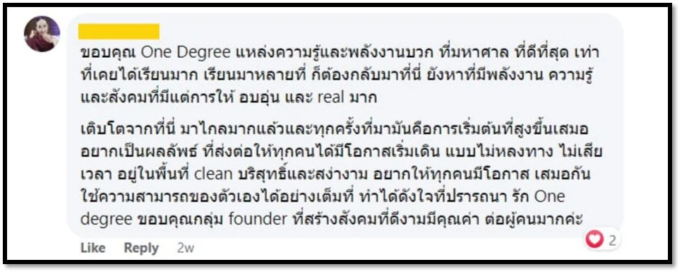 “ขอบคุณ One Degree แหล่งความรู้ และพลังงานบวก ที่มหาศาล ที่ดีที่สุด เท่าที่เคยได้เรียนมา”