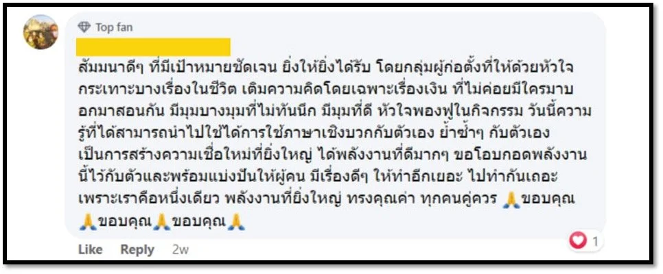 “ดีใจที่ได้อยู่ในสังคมนี้ สังคมดีๆ ของคนดีๆ ได้รู้เพิ่มขึ้นในด้านการเงิน การออม การลงทุน การสร้างธุรกิจ ได้รู้ว่าปัญหาของเราคืออะไร สเต๊ปของเราจะเป็นแบบไหนต่อ”