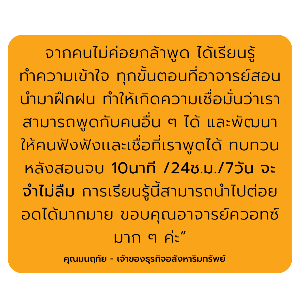 เป้าหมายของเราคือการช่วยให้ผู้เรียนเป็นนักพูดที่มั่นใจและมีประสิทธิภาพมากขึ้น และนักเรียนของเราหลายคนก็เกิดผลลัพธ์ที่ยอดเยี่ยมครับ ดังนั้นสิ่งที่คุณจะได้รับคือการวิธีการพัฒนาทักษะทางการสื่อสาร การเชื่อมและการสร้างความประทับใจกับผู้ฟัง ดังนั้นไม่ว่าคุณจะมีเป้าหมายในการเติบโตทางอาชีพ การงาน ธุรกิจ หรือแค่ต้องการพูดในที่ชุมชนได้อย่างผ่อนคลายมากขึ้น หลักสูตรนี้ก็สามารถช่วยให้คุณบรรลุเป้าหมายได้ครับ